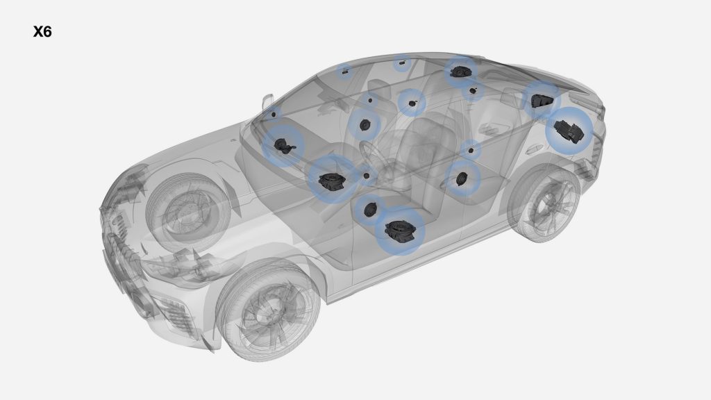 Hệ thống bao gồm 20 loa bố trí khắp cabin, giúp tạo âm thanh bao phủ toàn bộ không gian xe. Cấu hình loa thường gồm:
